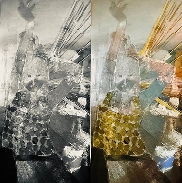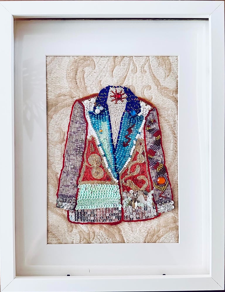 "BLAZER" COLLAGE CRISTALES, TELAS Y PIEDRAS SOBRE TELA (COLECCIÓN BOGOTÁ, COLOMBIA) 42X30 CMS-2025